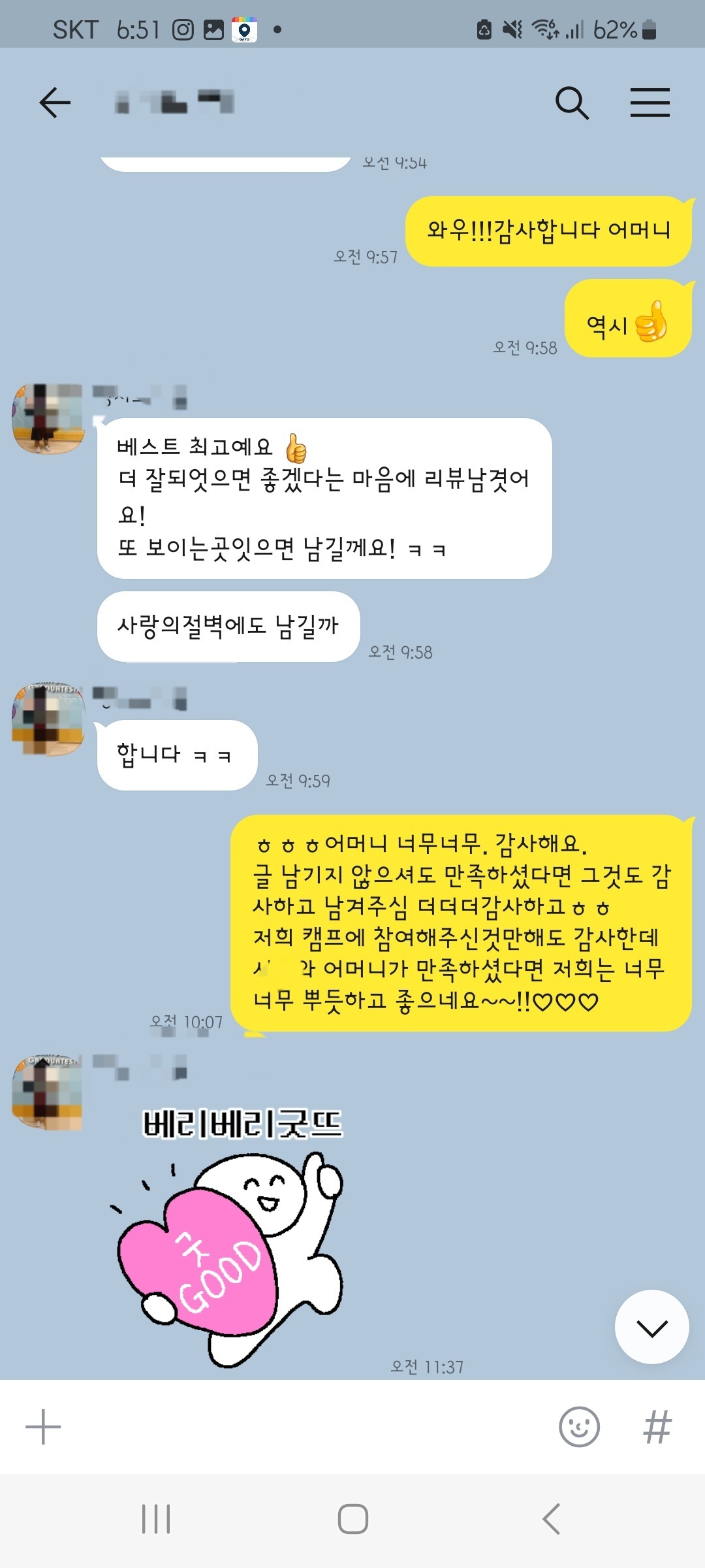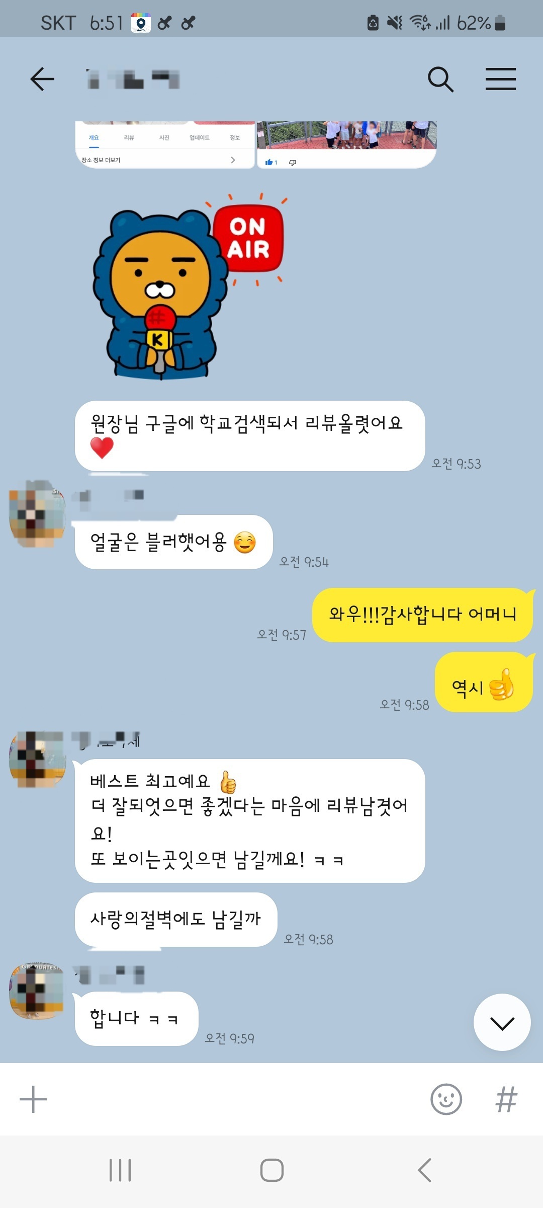 참가해주신 어머니 한분께서 저희 베스트아카데미 최고라는 칭찬과함께 구글에 글을 남겨주셨다고 카톡을 보내셨어요~~찐~~후기가 되겠죠??감사합니다^^
